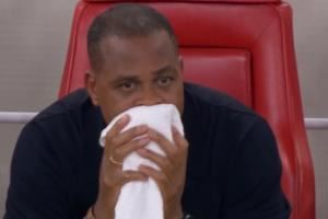 随后,他就一直坐在教练席上不断地用毛巾抹脸,眼眶泛红,场上队员和工作人员与马宁发生冲突时他也只是看着。